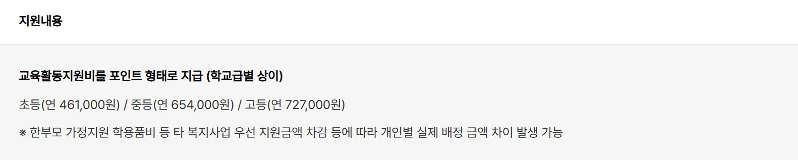 - 지원 금액 인상: 2024년 대비 평균 5% 인상되어 초등학생 487,000원, 중학생 679,000원, 고등학생 768,000원을 지원합니다.